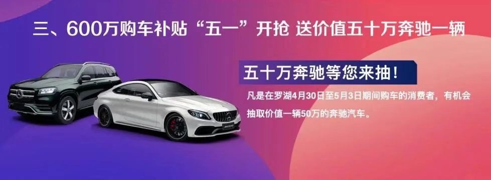 2.4月30日至5月3日,在罗湖区购车且享受政府补贴优惠,可于5月4日下午5:00在澳康达参与抽奖,奖品为价值50万元的奔驰汽车一辆。