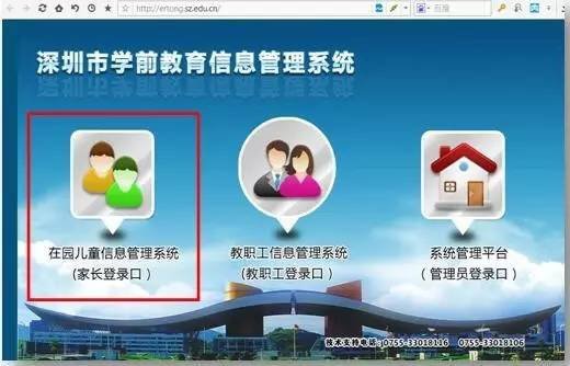 方式二:直接输入网址: http://ertong.sz.edu.cn/,进入 " 深圳市学前教育信息管理系统 ",点击 " 在园儿童信息管理系统 ( 家长登陆口 ) "。
