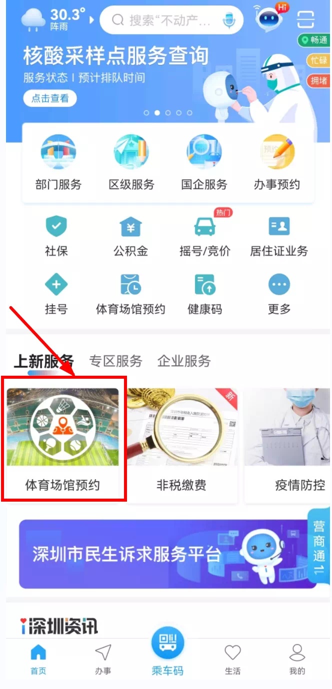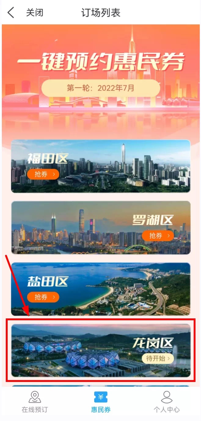 ①方式一:登录“i深圳”APP,点击首页【体育场馆预约】,选择底栏【惠民券】,找到【南山区】,即可参与抢券。