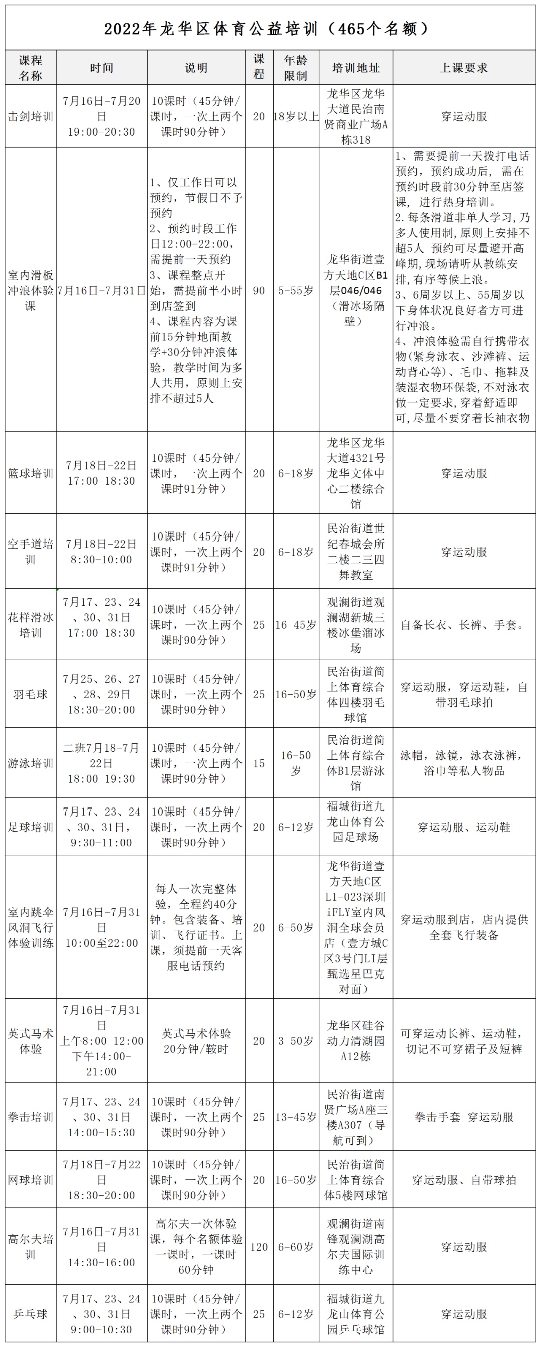 据了解,第四期共计465个名额,由系统抽签决定,报名先后顺序不影响结果。7月14日至7月15日将以短信的方式通知中奖人员获得公益培训名额,收到中签短信即为报名成功。各项目上课时间、地点、课时、年龄要求、课程介绍等详见下表。更多流程信息,也可持续关注“龙华文体云”微信公众号。