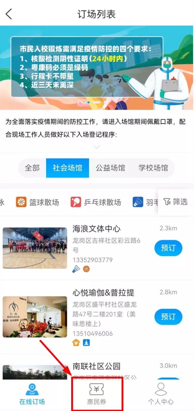 ②搜索打开“体育场馆预约”页面,选择“一键预约惠民券-龙岗区”即可参与抢券。(每名用户每期限抢一张,券面金额随机)