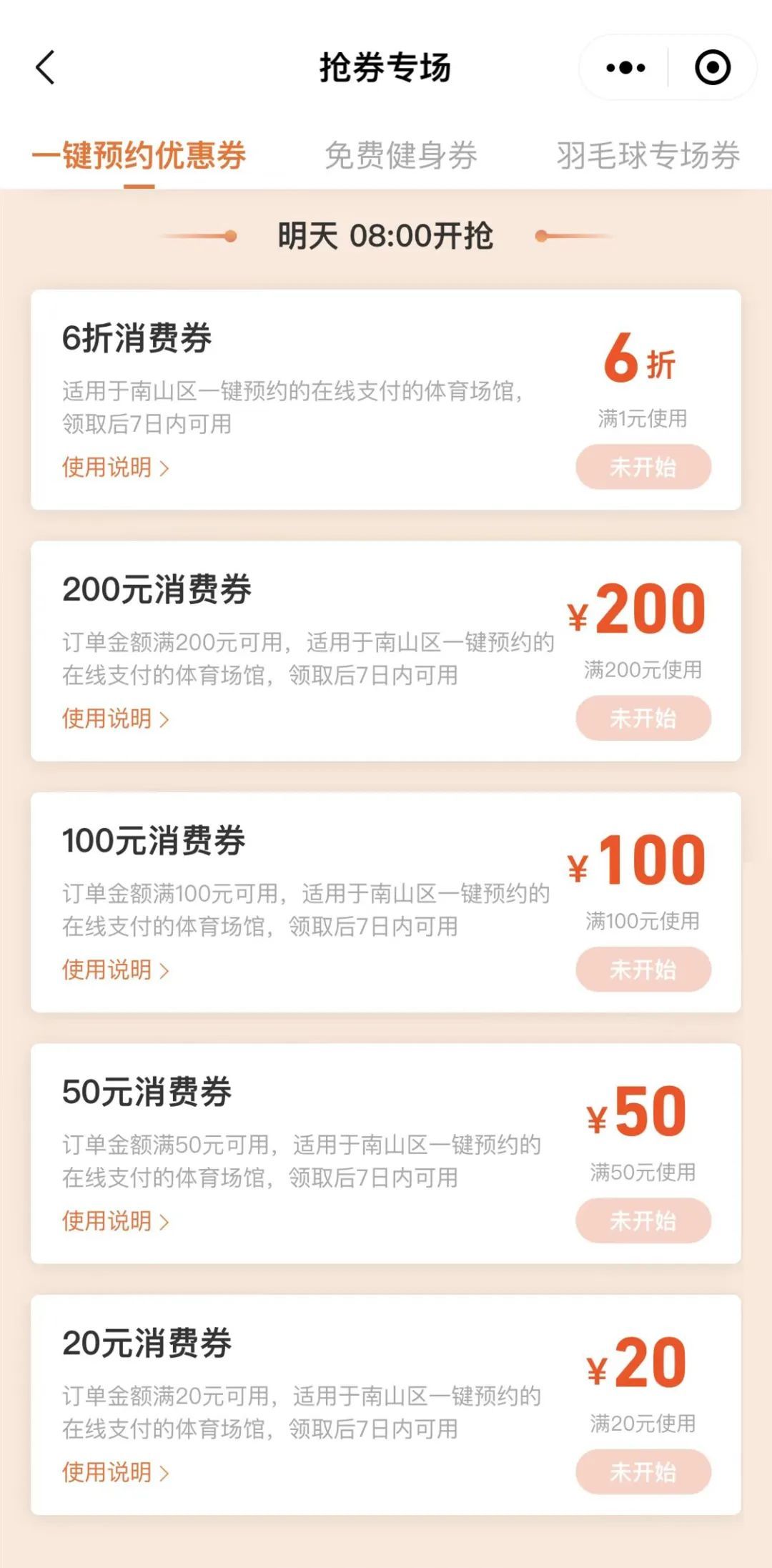 采用抢券模式,每天固定时间开抢,先到先得。每个账户每周限抢一张消费券,消费券有效期为7天,适用于南山区一键预约平台开通在线支付的体育场馆。