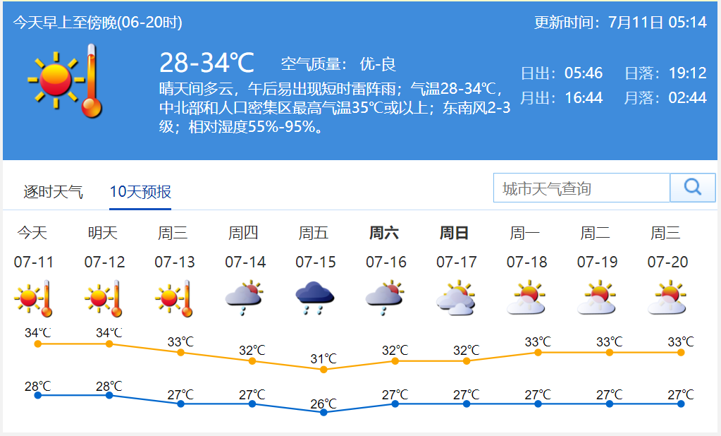 今日天气:晴天间多云,午后易出现短时雷阵雨;气温28-34℃,中北部和人口密集区最高气温35℃或以上;东南风2-3级;相对湿度55%-95%。