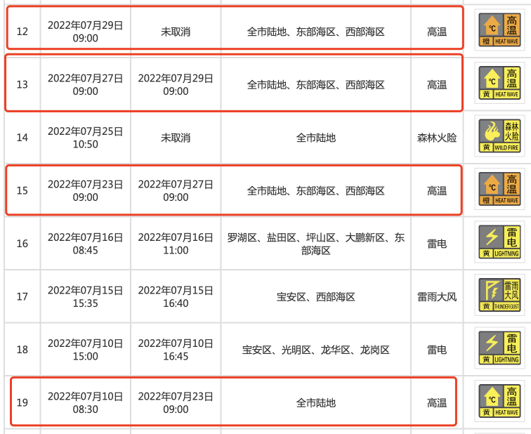 小南略略计算了一下,深圳7月高温预警发布四次,其中两次为橙色高温预警,整个持续时间21天