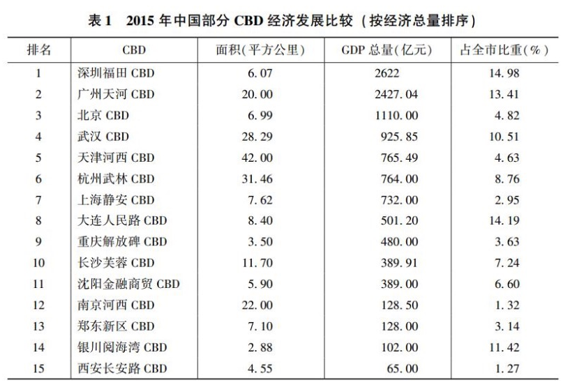 从经济规模看,2015年,深圳福田CBD、广州天河CBD、北京CBD位居前3位,地区生产总值均超过了1000亿元。其中深圳福田CBD的GDP总量为2622亿元。