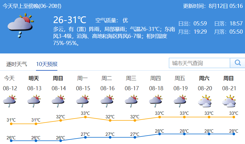 今日天气:多云,有(雷)阵雨,局部暴雨;气温26-31℃;东南风3-4级,沿海、高地和海区阵风6-7级;相对湿度75%-95%。