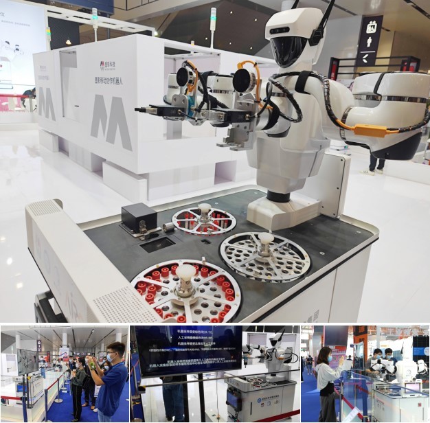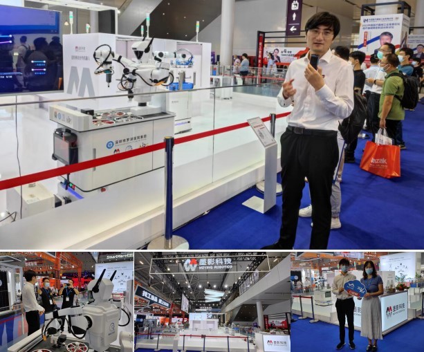走进4号馆,一众机器人产品吸睛无数。进馆首位所见的双臂移动协作机器人,该款机器人为深圳墨影科技有限公司联合深圳市罗湖医院集团、深圳市人工智能与研究院出的全球首款全流程仿真鼻咽拭子采样机器人。