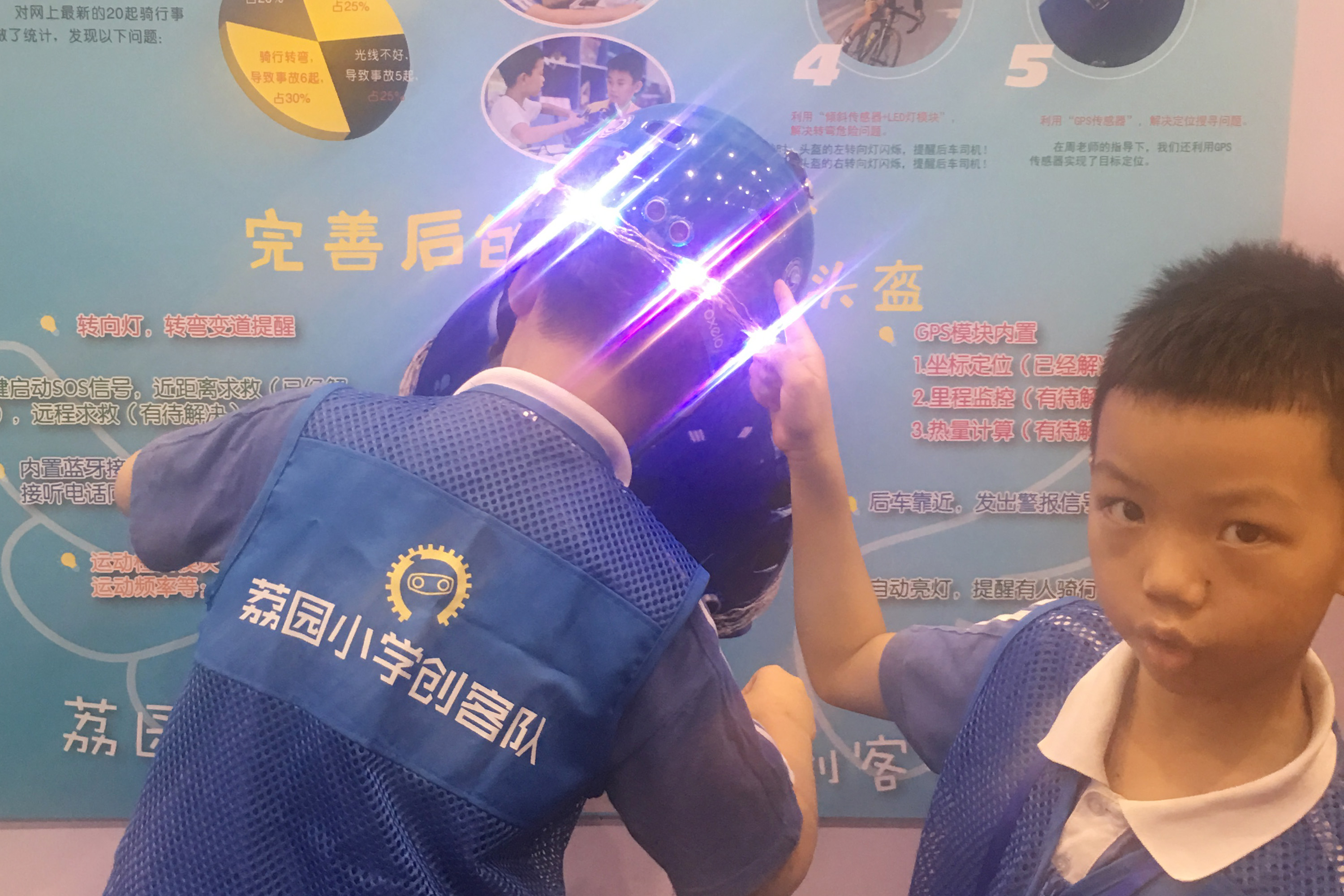 在展示现场,周奕辰和小伙伴一个演说、一个戴骑行头盔配合演示,相当默契。据其介绍,该款头盔有多项功能,利用“倾斜传感器+LED灯模块”解决光线不足问题,骑行时,骑行者身体自然前倾,头盔便会亮灯,提醒后车司机,前面有人;利