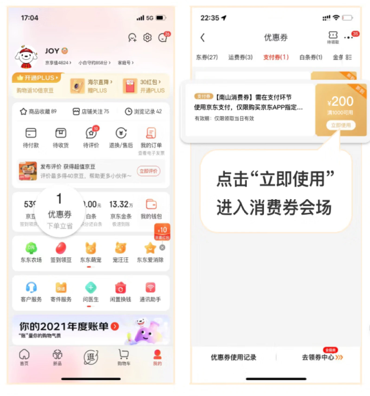 打开京东APP,登录已领取消费券的京东账户,可在“我的”-“优惠券”页面查看并使用已领取的消费券。