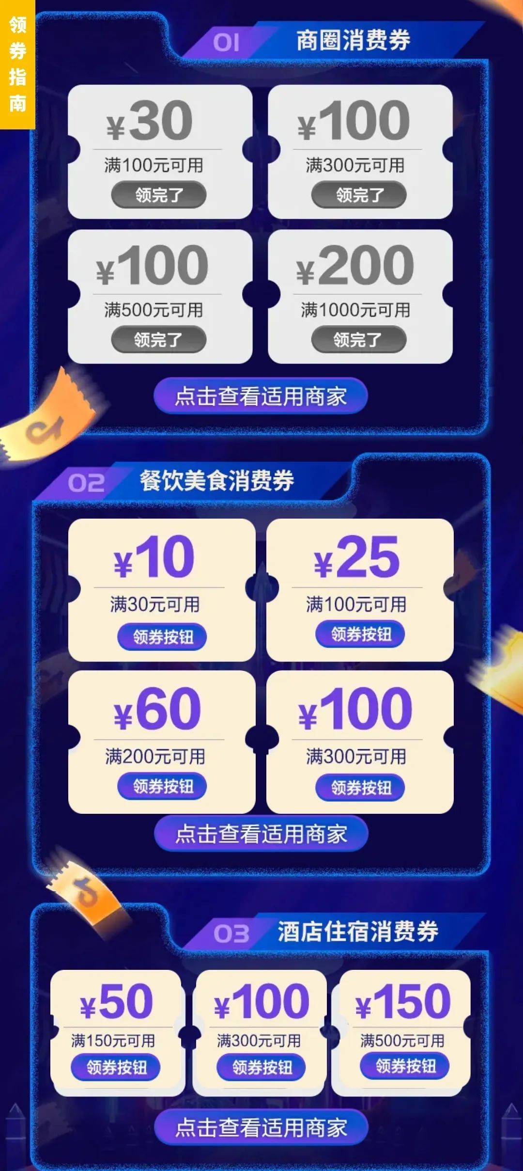 消费券自领取之日起5天(5*24小时)内有效,单用户活动期间每种消费券限领取5张,领券后可在指定商户进行使用。
