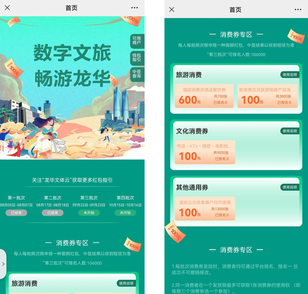 第三轮龙华区文旅消费券共发放300万元,于9月22日10:00开启报名