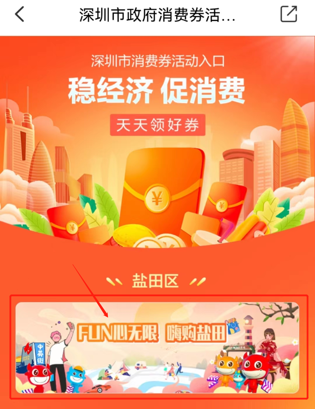 活动入口:云闪付APP,大家可以在手机应用市场下载。进入后定位到深圳,点击首页的【政府消费券】-活动页面