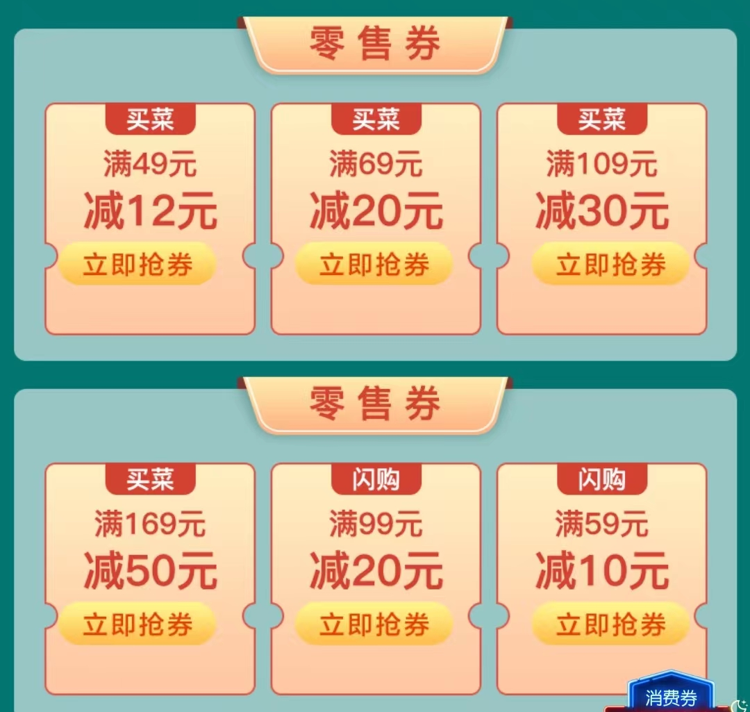 生鲜消费券:满49减12、满69减20、满109减30、满169减50