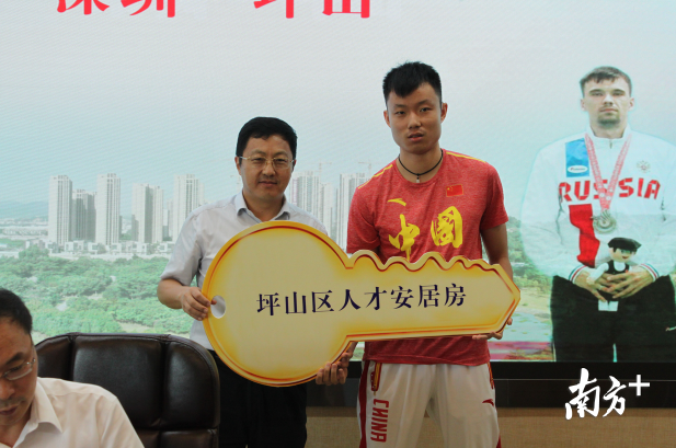 欢迎仪式上,坪山区与深圳市残联代表分别向唐楷峰赠送人才安居房的钥匙及专业羽毛球拍,唐楷峰回赠1件第23届夏季聋人奥林匹克运动会中国代表队参赛球衣作为纪念。