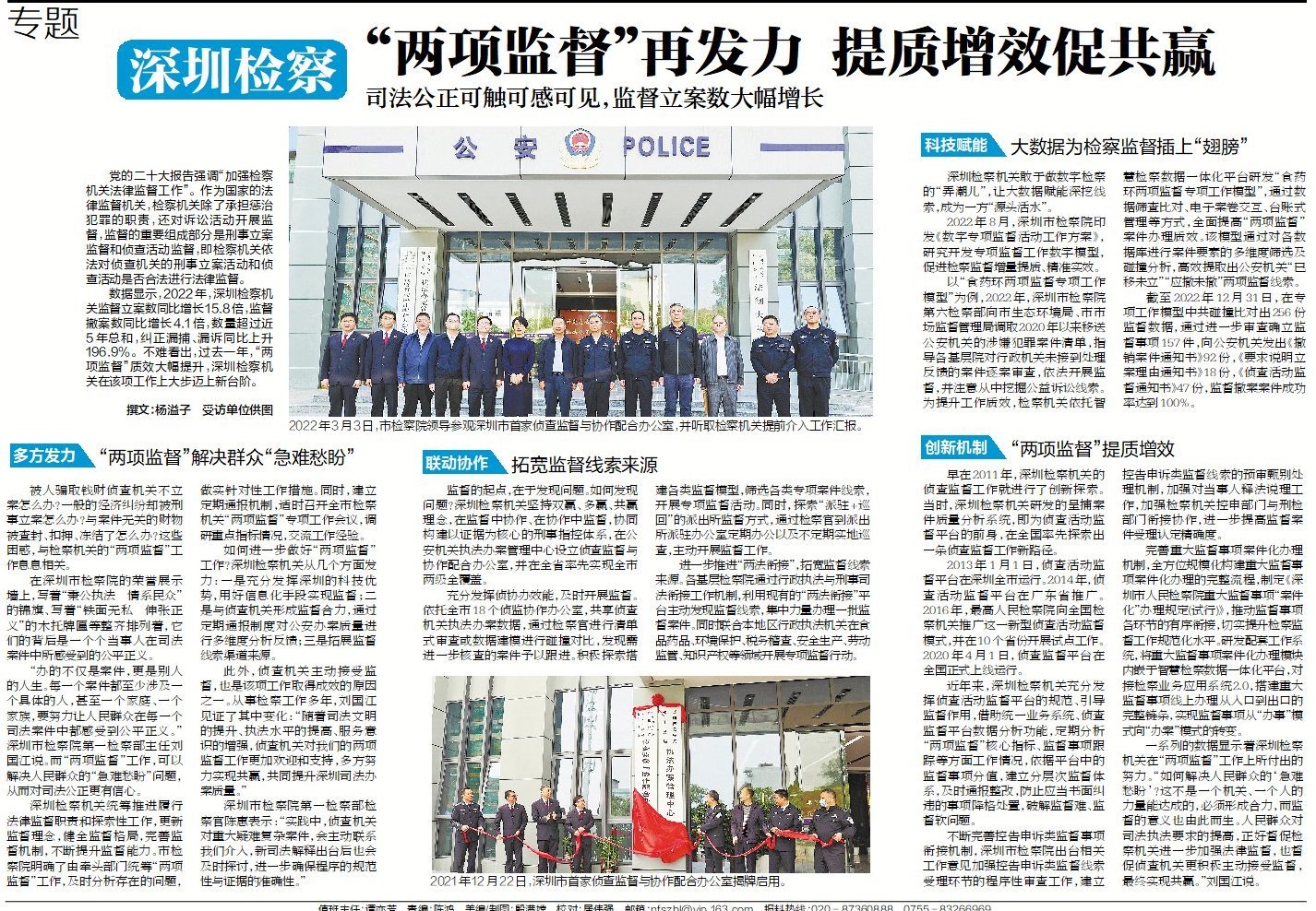 一系列的数据显示着深圳检察机关在“两项监督”工作上所付出的努力。“如何解决人民群众的‘急难愁盼’?这不是一个机关、一个人的力量能达成的,必须形成合力,而监督的意义也由此而生。人民群众对司法执法要求的提高,正好督促检察机关进一步加强法律监督,也督促侦查机关更积极主动接受监督,最终实现共赢。”刘国江说。