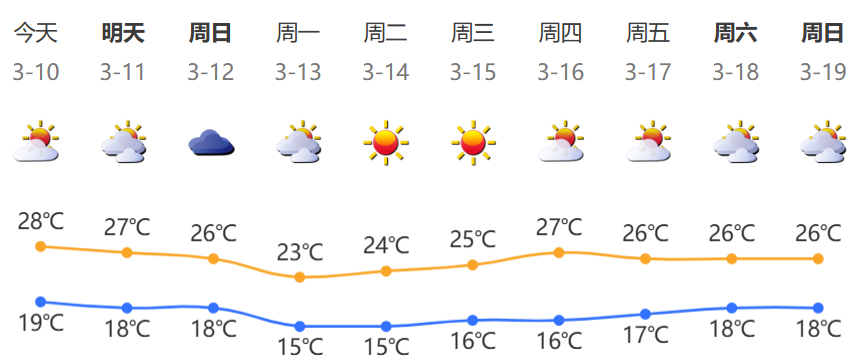 今日天气:晴天间多云,早晚有轻雾;气温19-28℃;东风3级,沿海、高地和海区阵风6级;相对湿度50%-90%。
