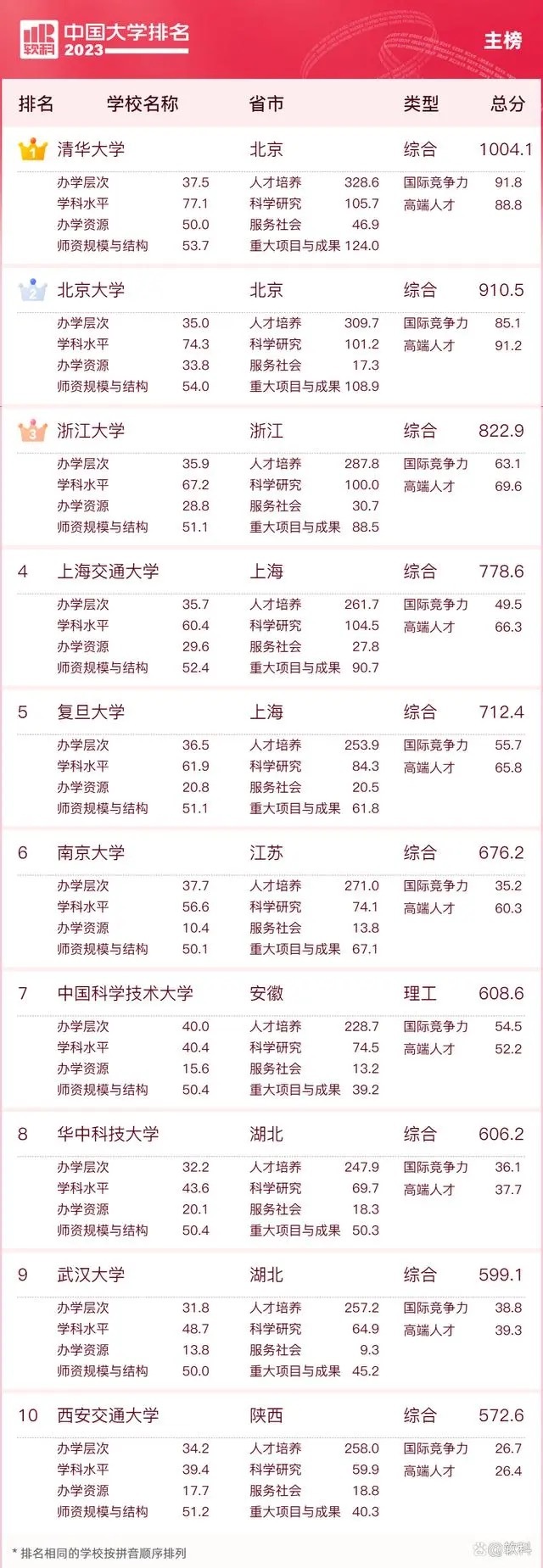2023软科中国大学排名(主榜)的上榜高校共有590所。排名前十的大学依次为:清华大学、北京大学、浙江大学、上海交通大学、复旦大学、南京大学、中国科学技术大学、华中科技大学、武汉大学、西安交通大学。