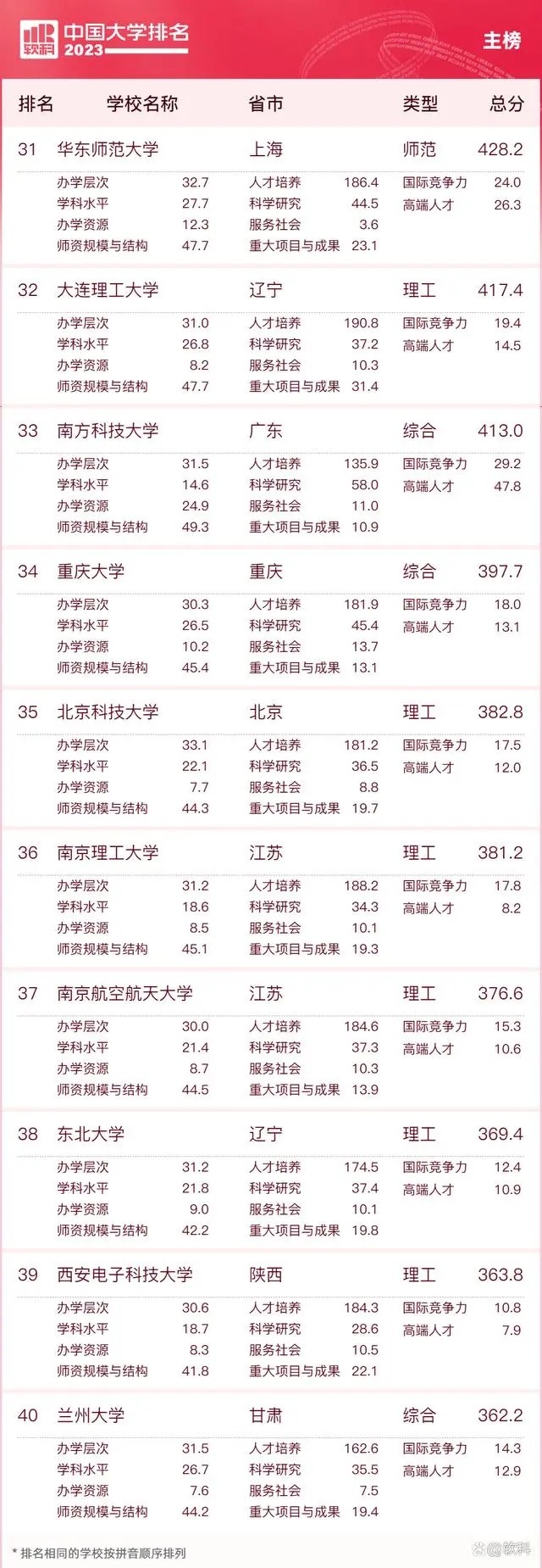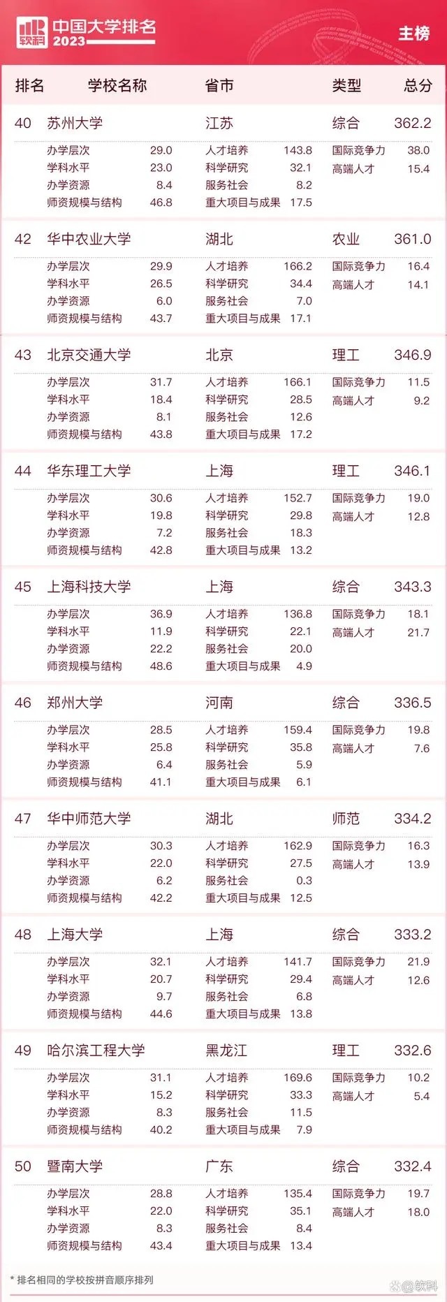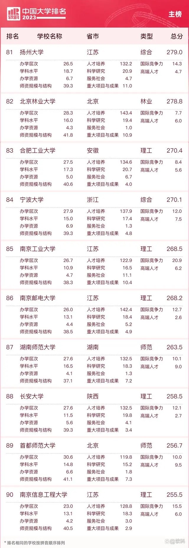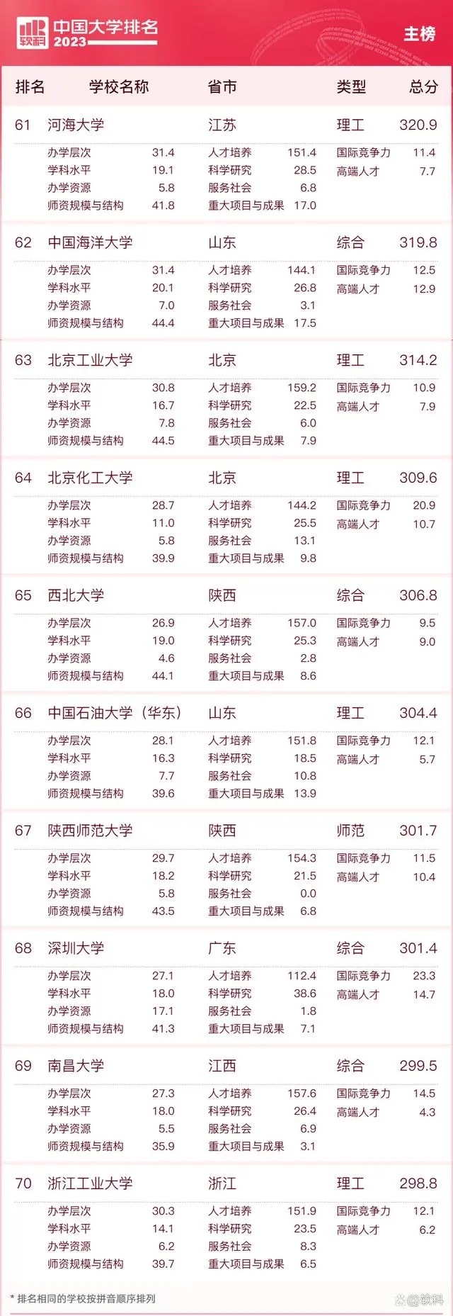 “软科中国大学排名”前身是“软科中国最好大学排名”,2015年首次发布。 “2023软科中国大学排名”的对象是中国1000多所本科层次的高校,为恰当反映高校在学校性质和学校类型上的差异、确保排名的公平性,软科将高校划分为综合性大学、7类单科性大学、4类非公办大学,采用差异化的指标体系分别排名。评价体系设置了十大评价模块,细分36个评价维度,内嵌100项评价指标,涉及345个评价变量,是对中国大学办学水平的立体化监测式评价。