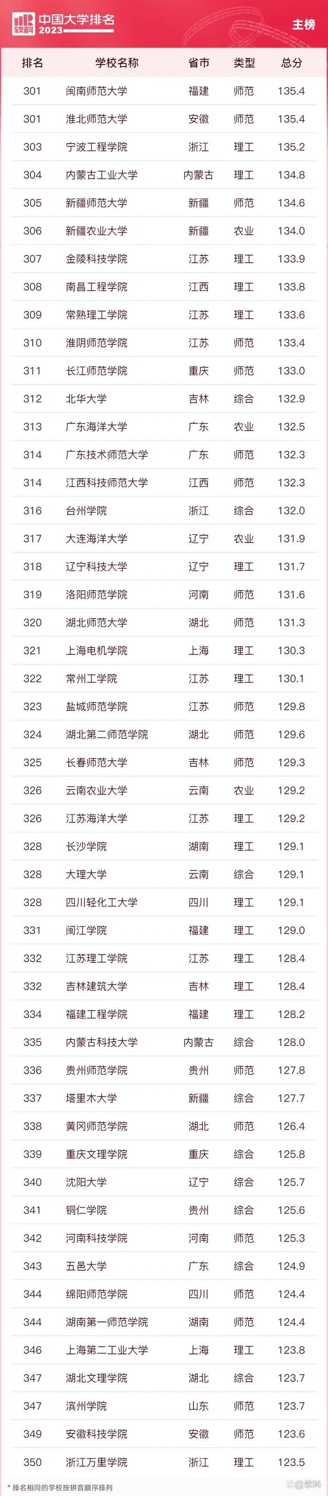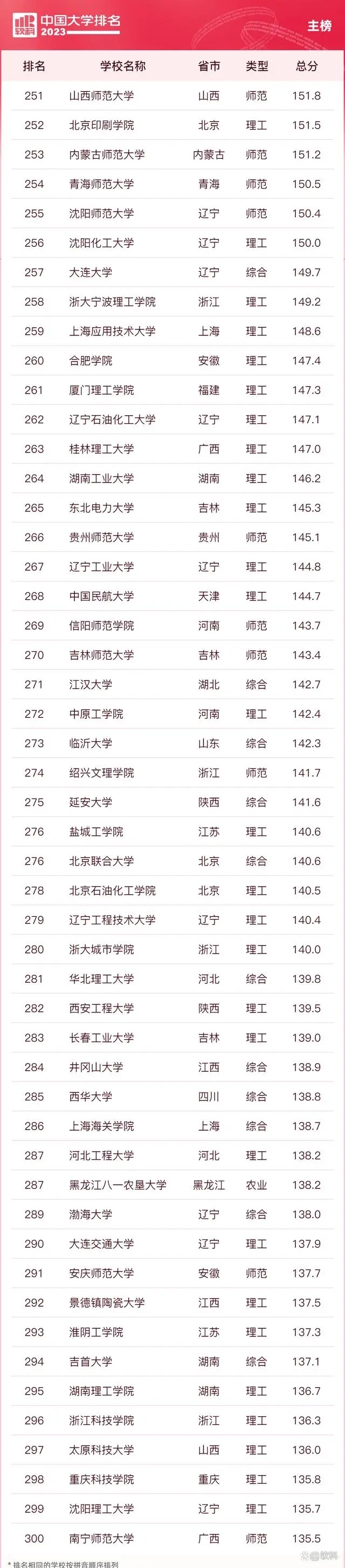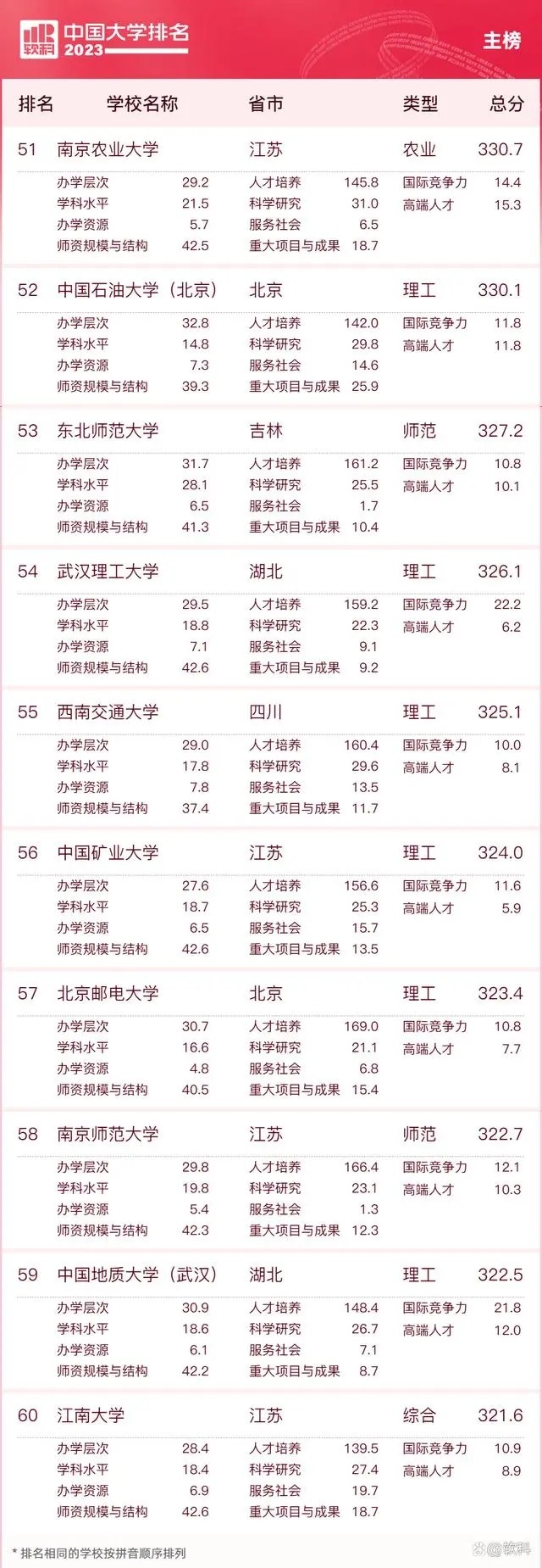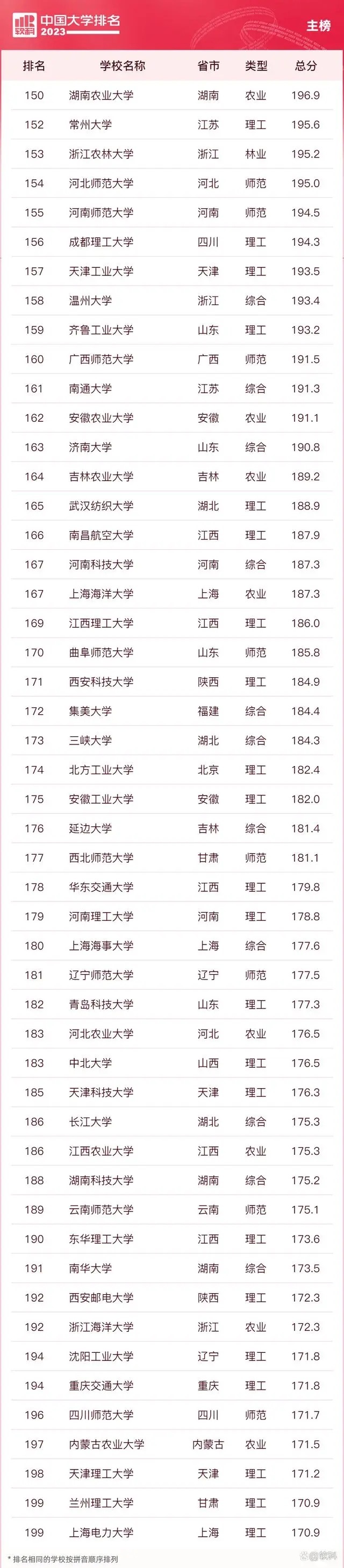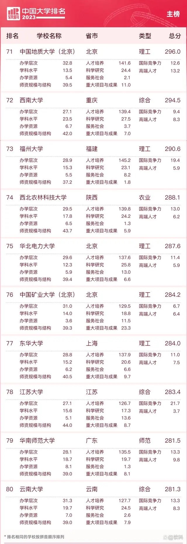 “软科中国大学排名”前身是“软科中国最好大学排名”,2015年首次发布。 “2023软科中国大学排名”的对象是中国1000多所本科层次的高校,为恰当反映高校在学校性质和学校类型上的差异、确保排名的公平性,软科将高校划分为综合性大学、7类单科性大学、4类非公办大学,采用差异化的指标体系分别排名。评价体系设置了十大评价模块,细分36个评价维度,内嵌100项评价指标,涉及345个评价变量,是对中国大学办学水平的立体化监测式评价。
