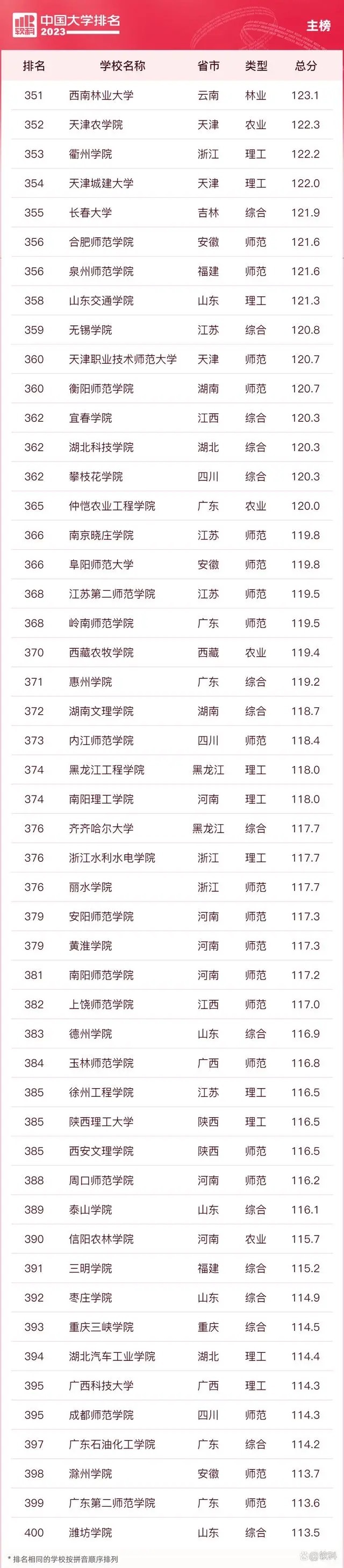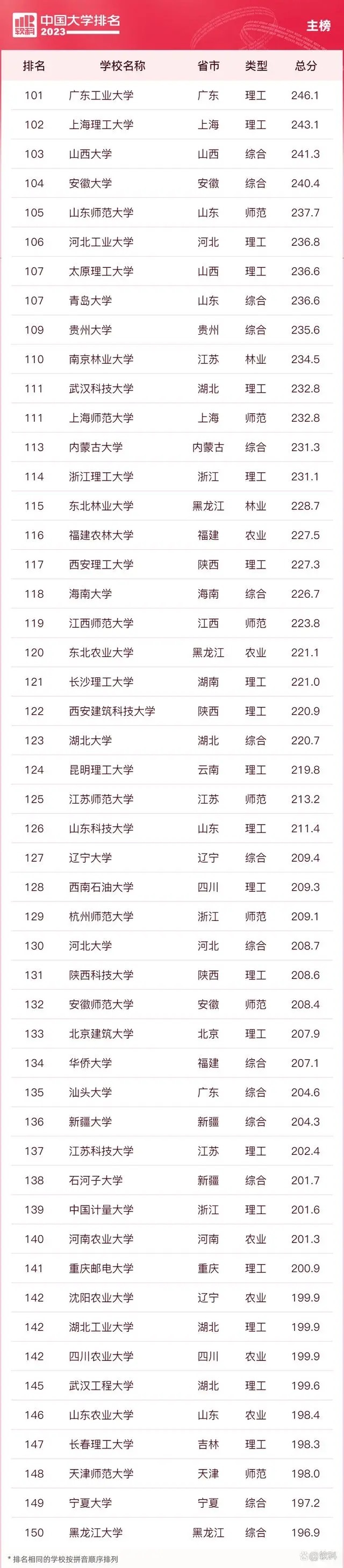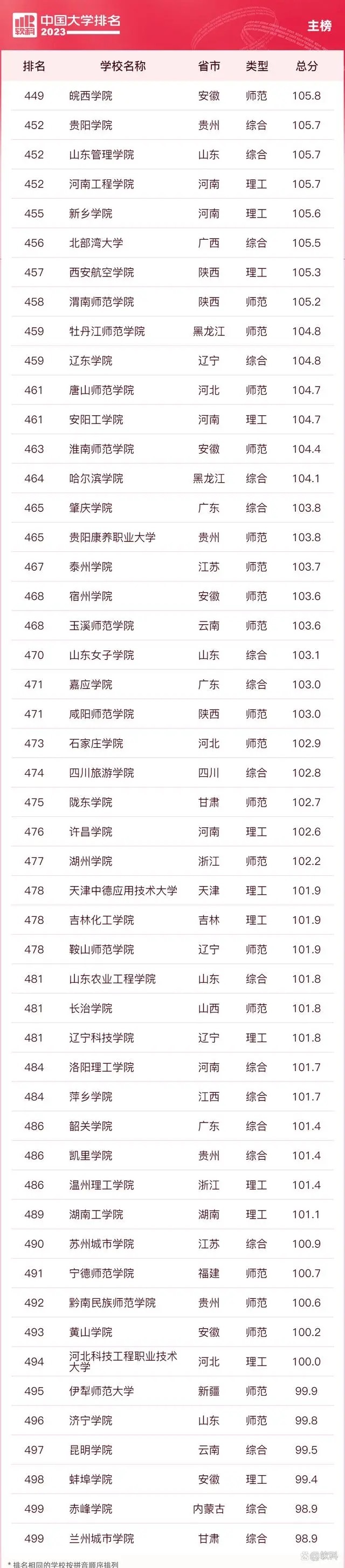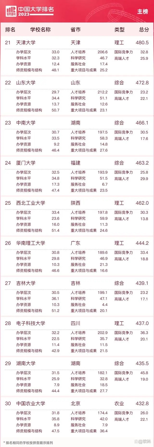 “软科中国大学排名”前身是“软科中国最好大学排名”,2015年首次发布。 “2023软科中国大学排名”的对象是中国1000多所本科层次的高校,为恰当反映高校在学校性质和学校类型上的差异、确保排名的公平性,软科将高校划分为综合性大学、7类单科性大学、4类非公办大学,采用差异化的指标体系分别排名。评价体系设置了十大评价模块,细分36个评价维度,内嵌100项评价指标,涉及345个评价变量,是对中国大学办学水平的立体化监测式评价。