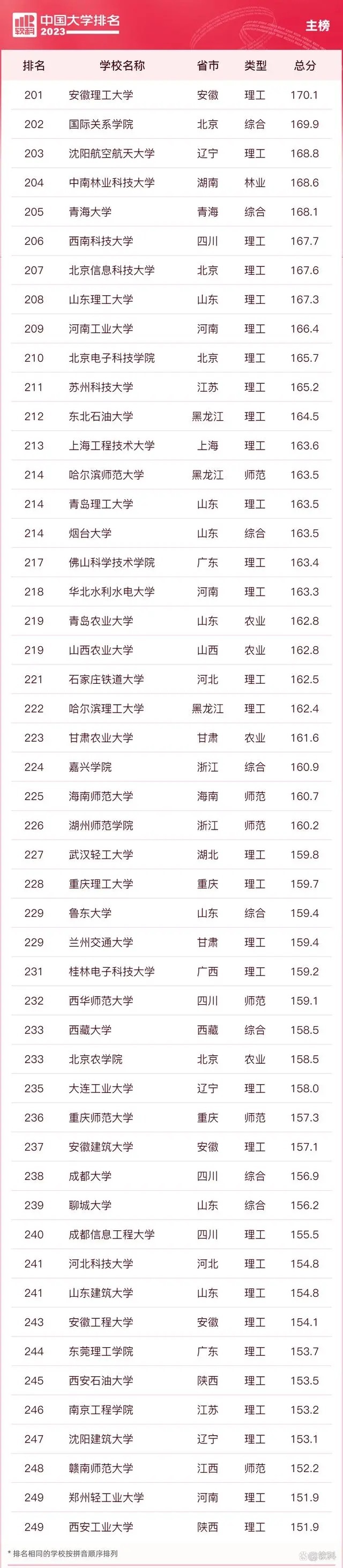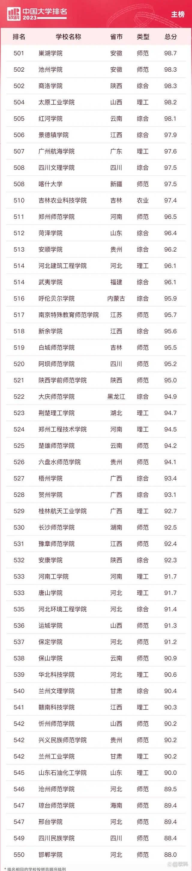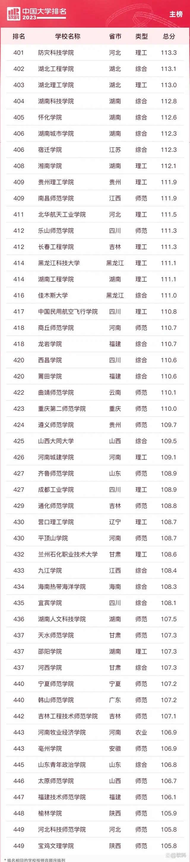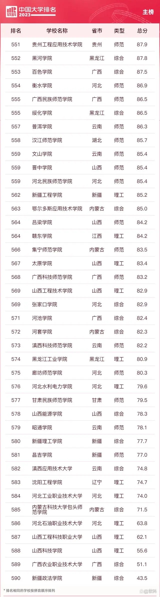 “软科中国大学排名”前身是“软科中国最好大学排名”,2015年首次发布。 “2023软科中国大学排名”的对象是中国1000多所本科层次的高校,为恰当反映高校在学校性质和学校类型上的差异、确保排名的公平性,软科将高校划分为综合性大学、7类单科性大学、4类非公办大学,采用差异化的指标体系分别排名。评价体系设置了十大评价模块,细分36个评价维度,内嵌100项评价指标,涉及345个评价变量,是对中国大学办学水平的立体化监测式评价。