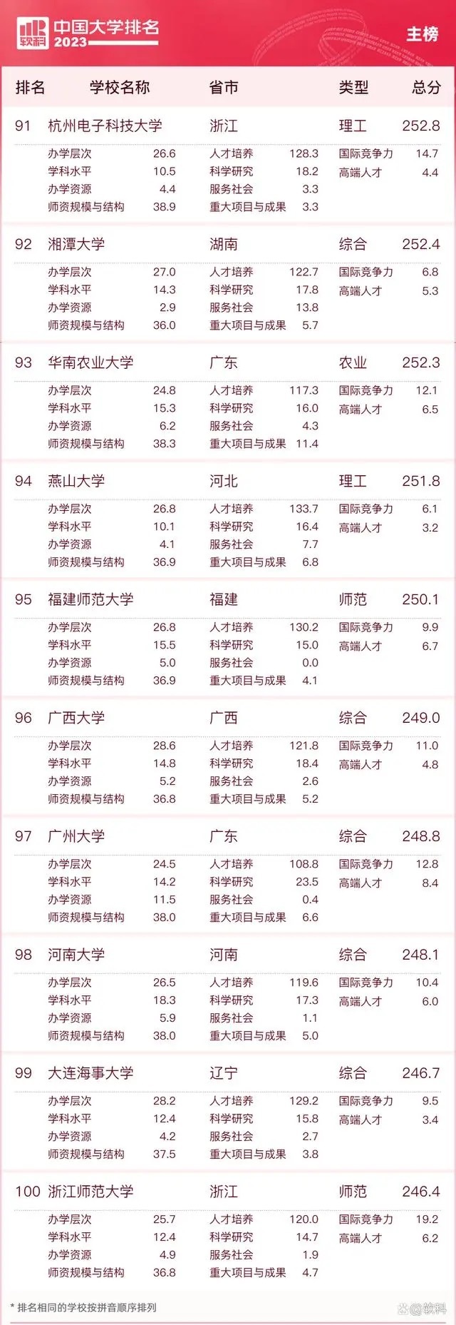 广东有8所高校入选前100强,分别为中山大学(11名)、华南理工大学(26名)、南方科技大学(33名)、暨南大学(50名)、深圳大学(68名)、华南师范大学(79名)、华南农业大学(93名)、广州大学(97名)。