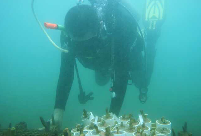 11月11日,一群穿着潜水服的环保志愿者替我们完成了心愿。当天,他们带着对大海的挚爱之情,将珊瑚种在了梅沙弯蔚蓝的海水里。