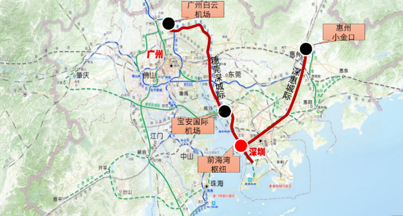 深惠城际线则起于前海,连接前海、西丽、深圳北、龙岗坪地、惠州西、惠州北等重点区域,全长约113公里,设计速度160公里/小时,实现前海1小时可达惠州。目前深惠城际前期工作正在开展。