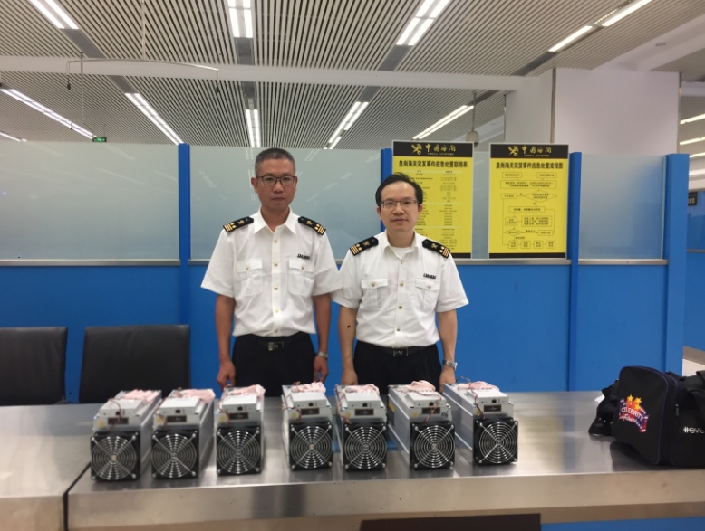关员询问旅客物品名称,旅客慌慌张张地表示,这些电子机器全部为“电源”。但经过海关对机器型号、外观等综合调查,这7台机器全部都是比特币“挖矿机”。