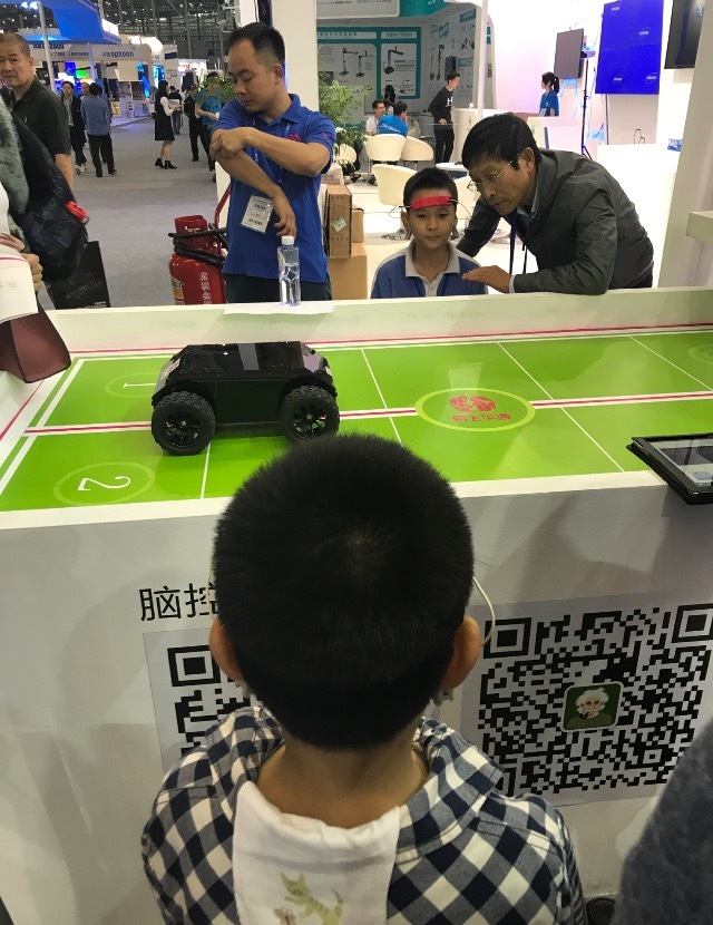 在高交会会场上,记者看到了一场特殊的赛车游戏:两个小朋友比赛用脑来控制赛车往左走还是往右走,车到达谁那边谁就胜利!原来,这是北京一家主要研究脑科学的科技公司研发的一款“脑控机器人”游戏。