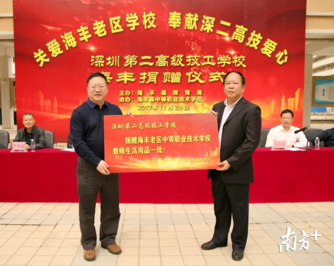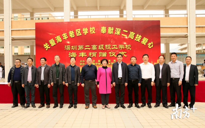 11月28日上午,在海丰县中等职业技术学校里洋溢着一股暖流,一场“关爱海丰老区学校,奉献深二高技爱心”捐赠仪式在这里举行。深圳市人社局、深圳二高技、海丰县委、海丰县中等职业技术学校、实验中学等300余人参加了仪式。