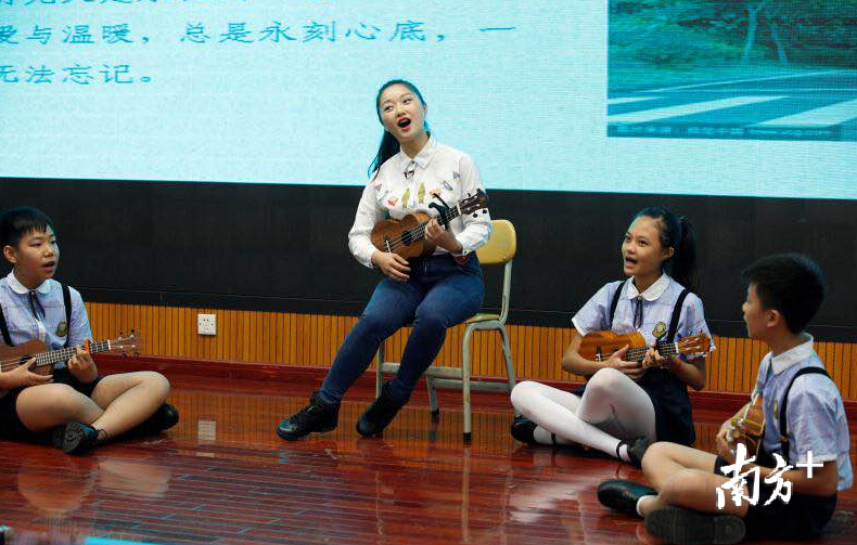 戴冰莹老师在和孩子们合奏尤克里里《童年》。