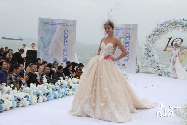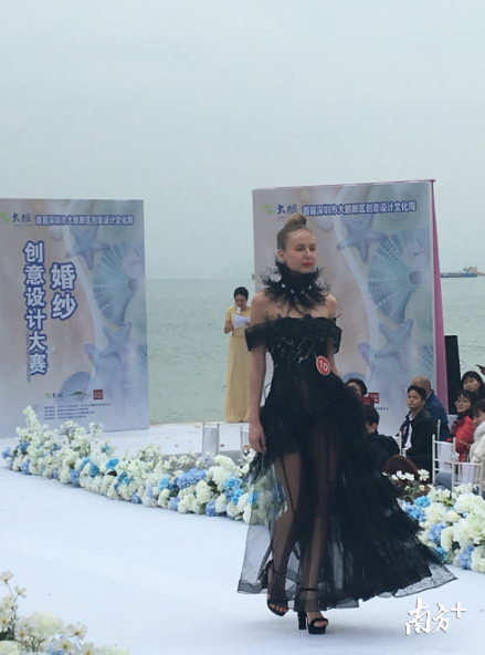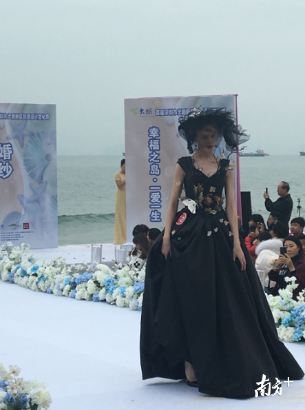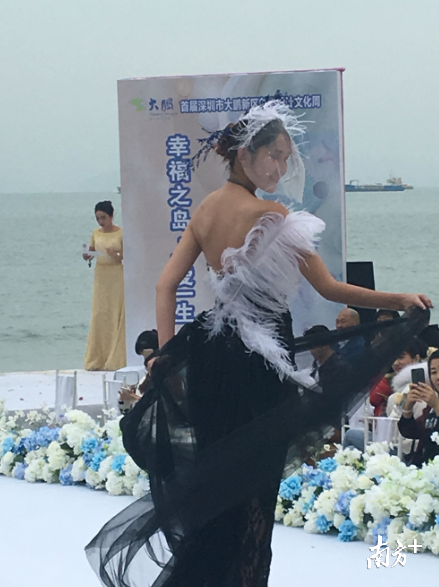 你见过黑色的婚纱吗,婚纱上插上羽毛?13日2017深圳大鹏文化季创意设计文化周之原创婚纱创意设计大赛在大鹏新区葵涌官湖村幸福岛摄影基地沙滩上举行。记者在现场看到,以大海为背景,模特们身着各种创意婚纱的精彩走秀让观众大呼过瘾。