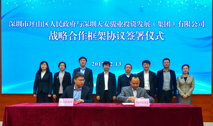 12月13日下午,坪山区人民政府与深圳天安骏业投资发展(集团)有限公司(以下简称“天安骏业集团”)在坪山区政府正式签订战略合作框架协议,借鉴“天安云谷”智慧园区模式在产、学、研上进行深度合作。