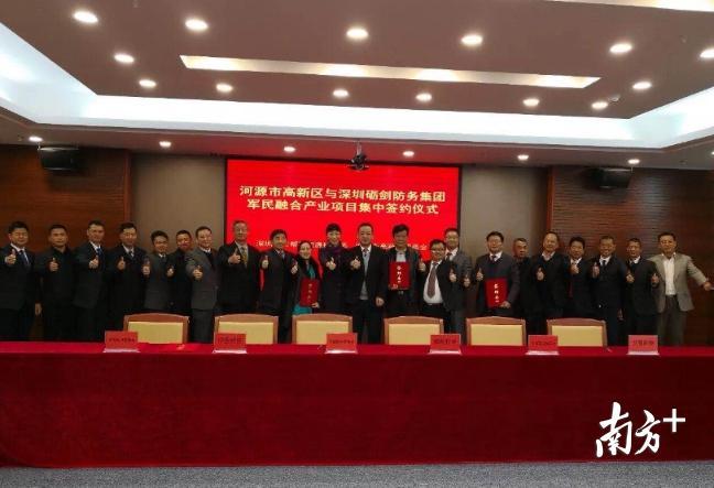 2月12日,在深圳对口帮扶河源指挥部的引进推动下,河源高新区、深圳对口帮扶河源指挥部与深圳砺剑防务集团举行军民融合产业项目集中签约仪式,3个项目均为拥有核心高新技术、市场前景广阔、别具特色的军民融合优质企业,项目一期总投资2亿元。