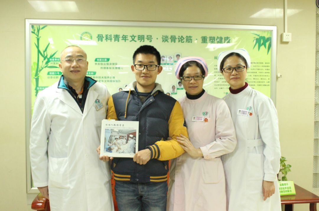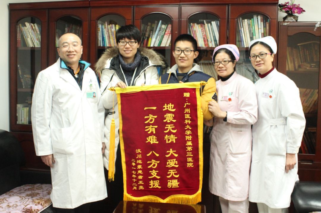 经过救治,王亮不仅避免了截肢的悲剧,最后健康出院回到四川继续学业。临走之前,王亮拉着吕玉明和谭健群在病区的门口的木椅上合影。他们就像王亮的再生父母,在他跌入谷底时,把他拉上来。这双腿,可以说是广州送给王亮的礼物。