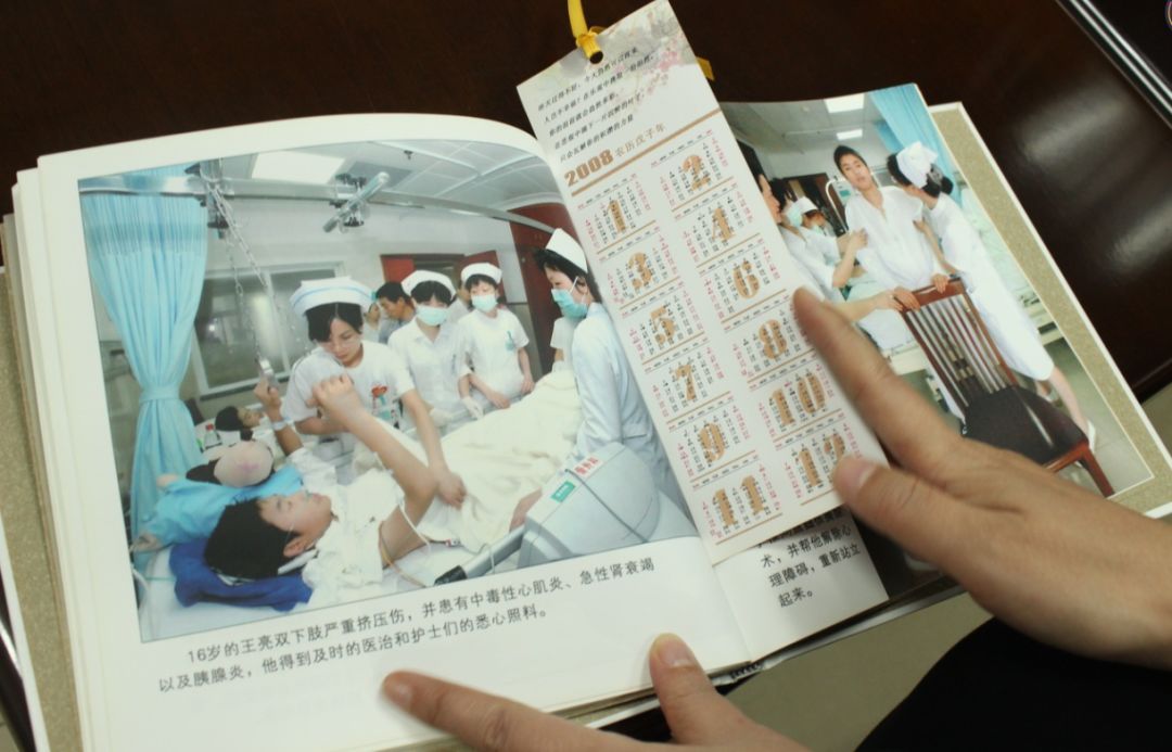 “当时,王亮才16岁,还是北川中学一名高一的学生。他是从四川的华西重症监护室直接送过来的,检查情况为:双下肢严重挤压伤,并患有中毒性心肌炎、急性肾衰竭以及胰腺炎。其间,王亮出现了病情恶化,两次进了ICU。”谭健群回忆道。