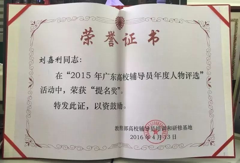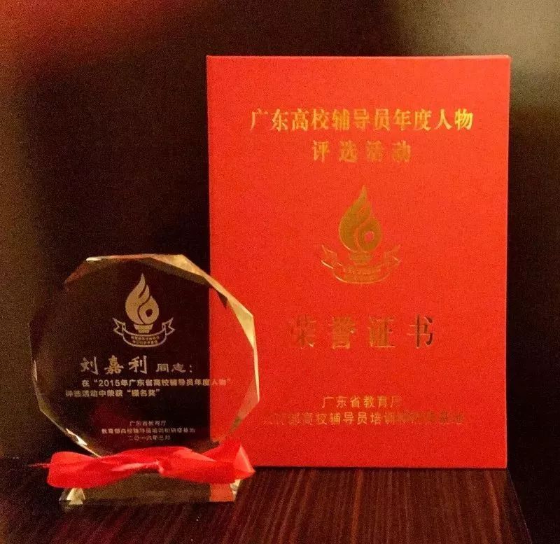 ▲刘嘉利2015年广东省高校辅导员年度人物提名奖