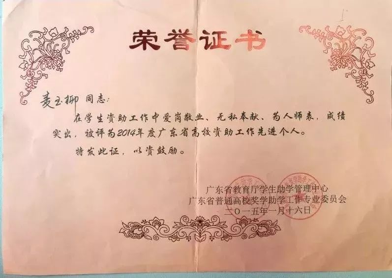 ▲麦玉柳·2015年省级资助工作先进个人