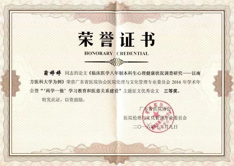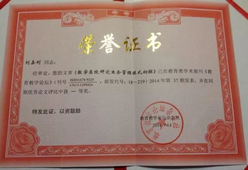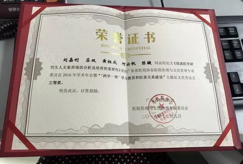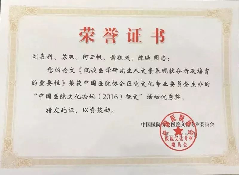 ▲刘嘉利·《浅谈医学研究生人文修养现状分析与培育重要性》论文获“中国医院文化论坛征文”活动优秀奖