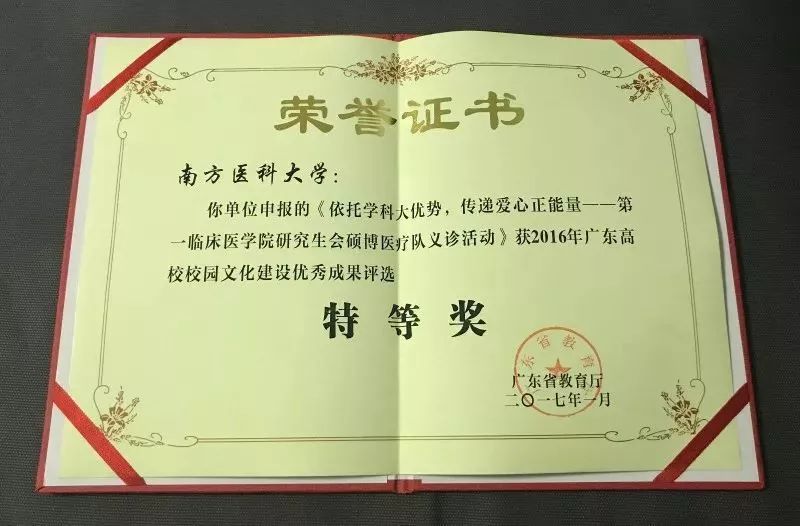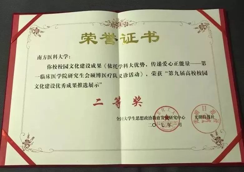 “硕博医疗队”于2017年分别荣获全国高校校园文化建设优秀成果优秀奖及省级特等奖,形成省级学生志愿服务项目1个、省级社会实践团队1个。