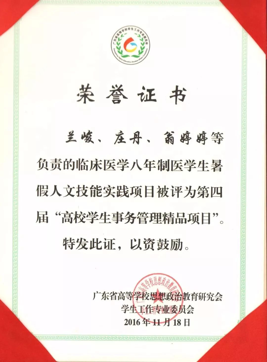 ▲刘嘉利.2016年广东高校校园文化建设优秀成果特等奖.2017年1月(省部级)