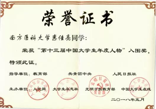 ▲惠佳亮第十三届中国大学生年度人物入围奖