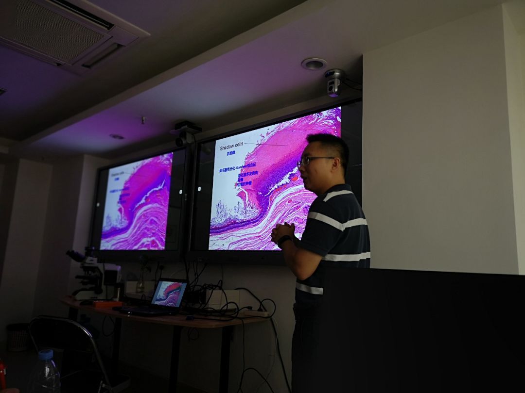 学习班上,专家教授采用理论与实际阅片相结合的讲授方法,从皮肤取材、制片、染色到正常皮肤组织结构、基本病理变化、阿克曼结构型式分析及各种模式疾病等进行了详细的讲解,并进行现场阅片。