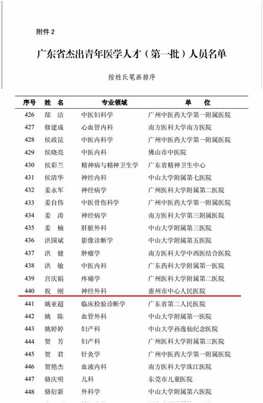 近日,广东省卫生计生委印发《广东省卫生计生委关于广东省医学领军人才和杰出青年医学人才(第一批)遴选结果的通知》,公布了第一批广东省医学领军人才和杰出青年医学人才入选名单。市中心人民医院神经外科主任祝刚斩获“广东省杰出青年医学人才”殊荣!