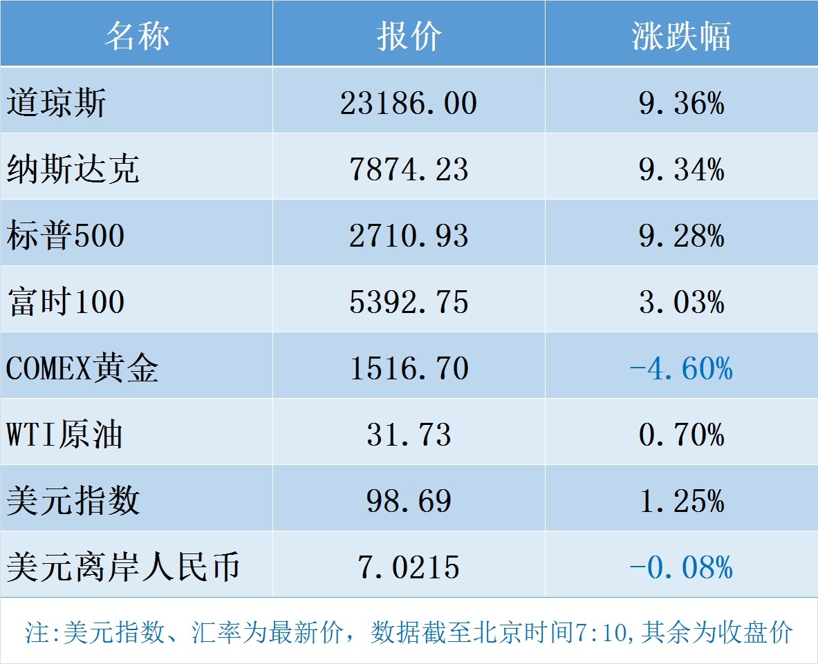 1、特朗普宣布国家进入紧急状态,以加速应对新冠肺炎疫情,美股尾盘飙升。截至收盘,道指上涨1973点,涨幅9.3%,报23174点;标普500指数上涨228点,涨9.2%;纳指涨9.3%。21老虎证券-中国50指数跌0.49%,报1011.21点。成分股中上涨20只,网易、台积电涨幅居前。