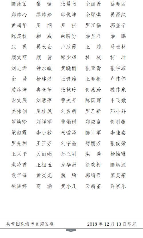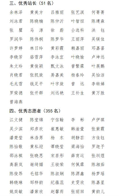 为进一步发挥典型示范作用,激励更多青年和社会公众参与志愿服务,团区委、区志愿者联合会决定授予吉林大学珠海学院团委等9个单位“第十二届中国航展金湾区志愿服务工作优秀组织”荣誉称号,授予珠海三灶城市资源运营有限公司等4家企业“第十二届中国航展金湾区志愿服务工作公益爱心企业”荣誉称号,授予吉林大学珠海学院余林泽等51名志愿者“第十二届中国航展金湾区志愿服务优秀站长”荣誉称号;授予吉林大学珠海学院江文健等355名志愿者“第十二届中国航展金湾区优秀志愿者”荣誉称号。