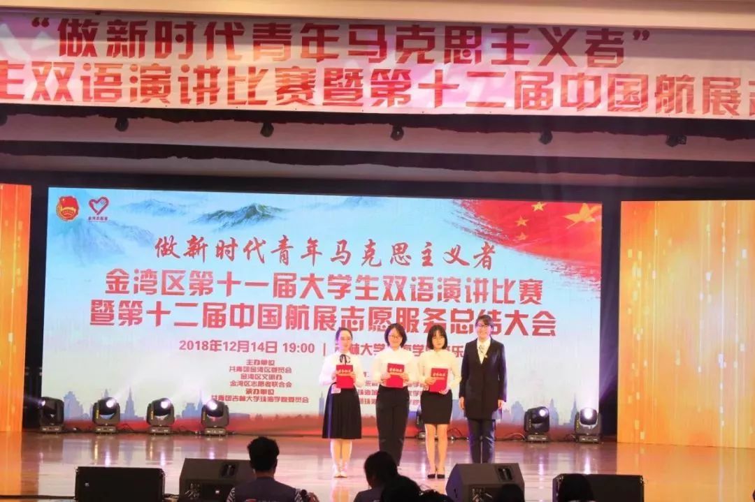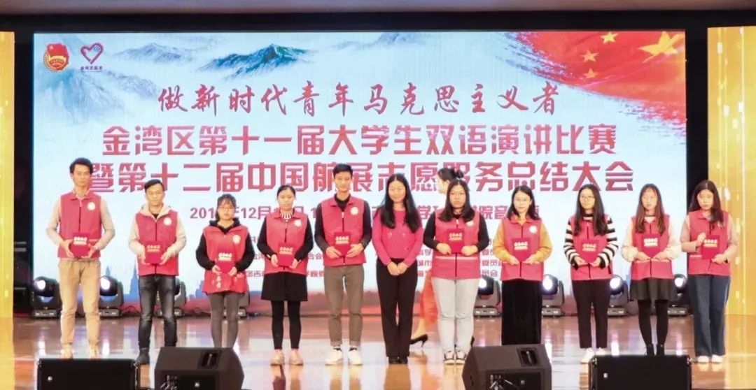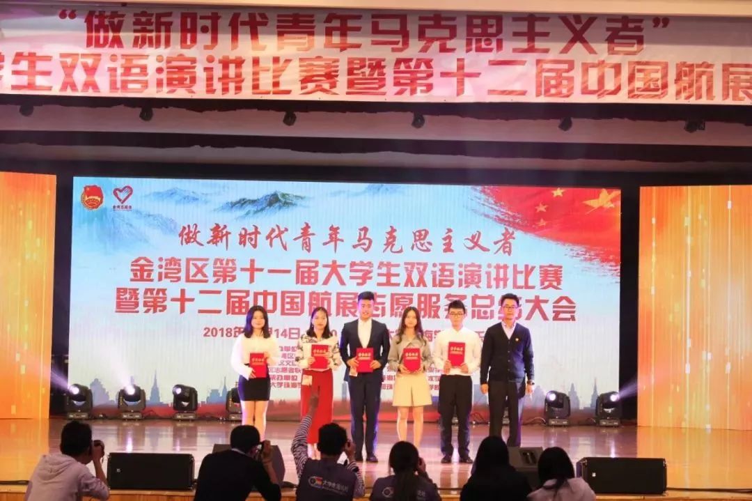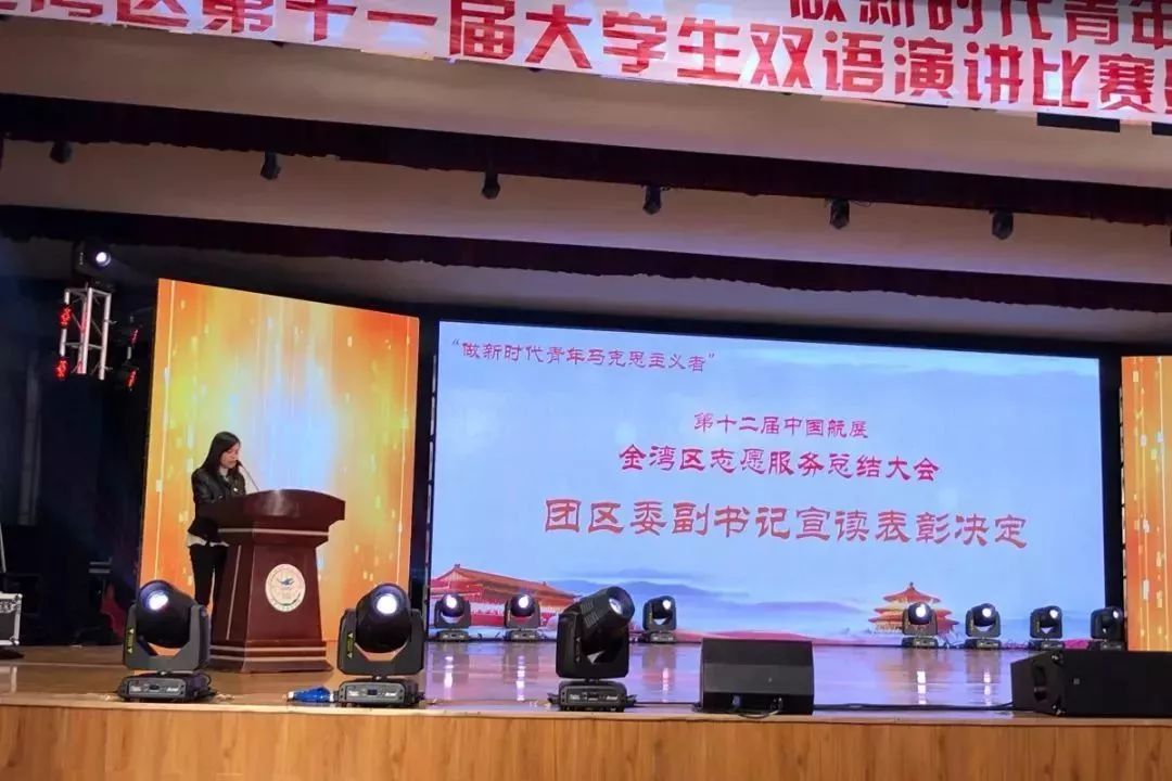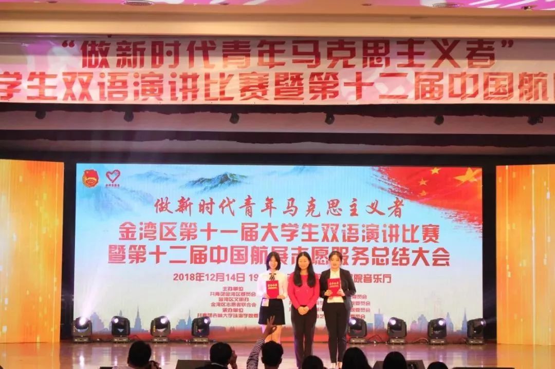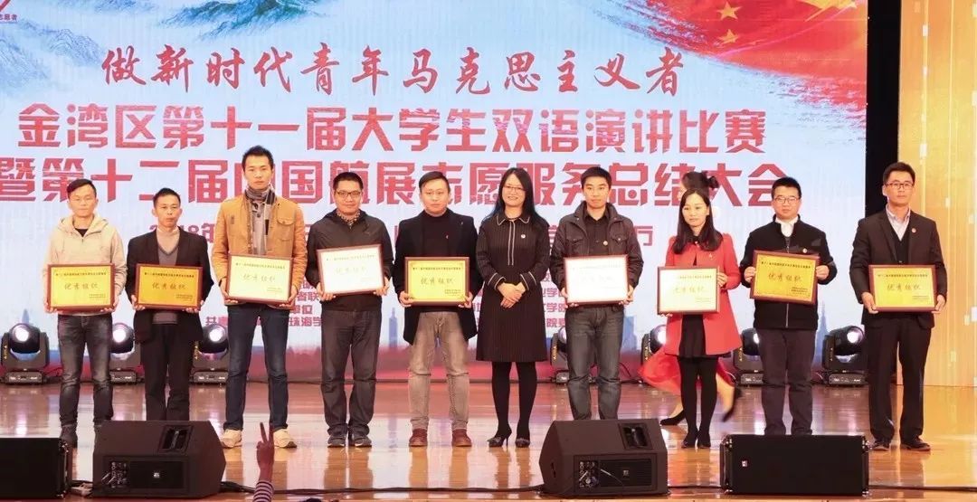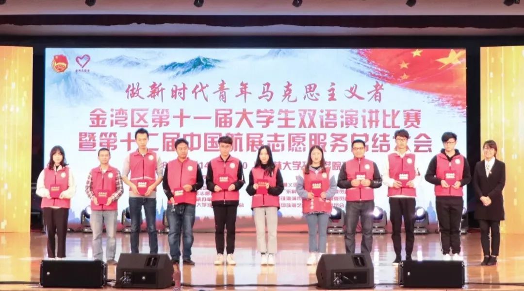 12月14日晚,共青团金湾区委、金湾区文明办、金湾区志愿者联合会在吉林大学珠海学院大学生音乐厅举办“做新时代青年马克思主义者”金湾区第十一届大学生双语演讲比赛暨第十二届中国航展金湾区志愿服务总结大会。来自金湾辖区5所高校和各志愿服务组织的500多名师生和志愿者参加大会并观看比赛。金湾区委常委、党政办主任拜燕,吉林大学珠海学院党委委员、副校长黄学寿,金湾区委宣传部副部长、区文明办主任林伟萍,共青团金湾区委员会书记于国潞,吉林大学珠海学院团委书记高英杰等领导出席活动,并为航展志愿服务工作优秀组织、公益爱心企业、优秀站长、优秀志愿者及双语演讲比赛获奖选手颁发奖牌和证书。