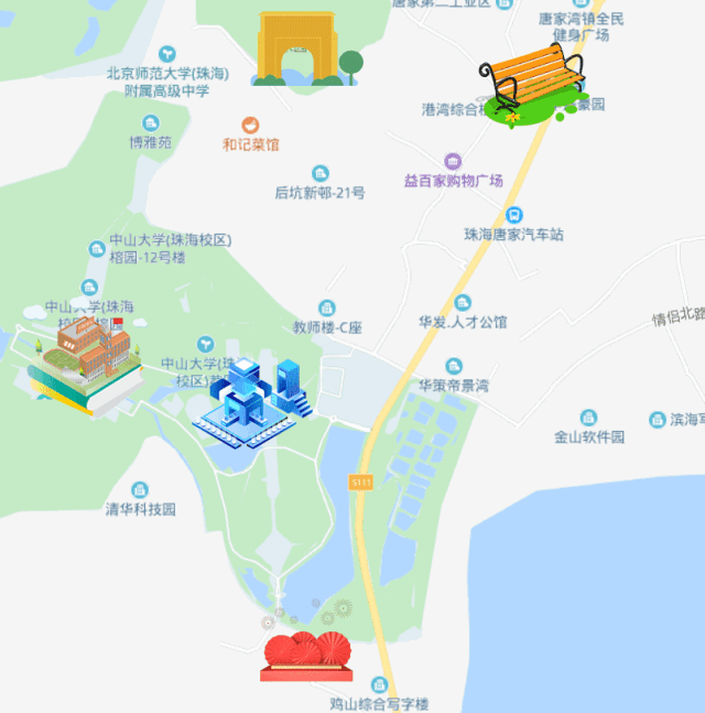 鸡山社区文体广场(开场)→清华科技园(打卡点)→中山大学(打卡点)→唐家文化广场(打卡点)→共乐大花园(会合)