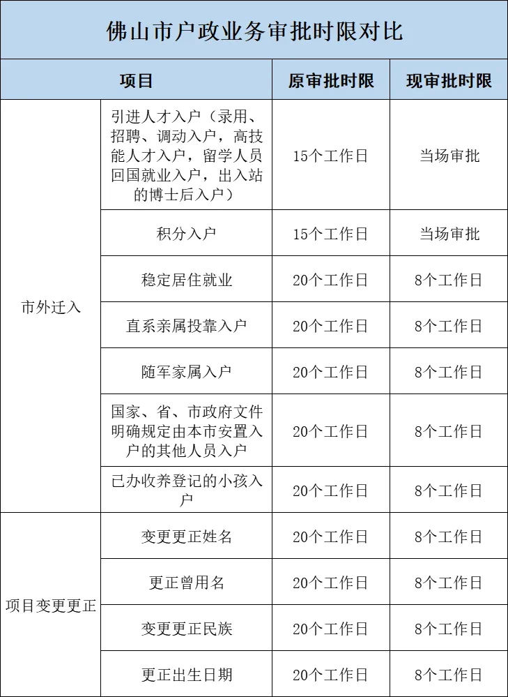 佛山办理入户再提速,办理人才入户、积分入户实现当场审批。为深入推进户政管理“放管服”工作,提高服务效率,佛山市公安局进一步优化户政业务审批流程,压减办结期限。